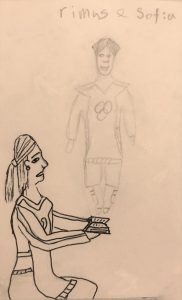 Among other characters that joined Kasume and the pirate crew, were Sofia and Rimus, Sofia was the librarian with her vast knowledge and grasp of history she was intended to be the character with all the answers. Probably I had intended for Kasume to have a lot of fire and enthusiasm, but be a little clueless. Sofia as a close friend was the opposite, she was quiet and preferred the company of books. In this sketch you can see that Rimus seems to be projected from the book, I imagined him as a ghost inhabiting the remains of his journal. Rimus was supposed to be an Arten from an earlier age, who gave great insights into the past. Although this idea hasn’t transferred literally into my later stories you can see some elements of it. Recycling the idea that souls can inhabit an animate objects, I created the Kiy stone. In book 3 Voyages, Kiyanna discovers a piece of Arten technology which projects the Kiy stone soul record, like an interactive hologram.