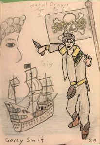 In the last article I talked about a character that evolved into two different characters, this time I’m looking at some characters that fell by the wayside, possibly for the better or the worst. In the silly fantasy story of learning to fly, our heroine was accompanied by a pirate crew. Led by the heroic captain Garey Smif, it’s testament to my bad spelling that Gary Smith could ever be spelt that way. Gary who prefer to be called Giy at 29 was supposed to be a sometimes good role model for Kass.