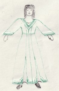 I should have also mentioned the grey detailing on the hem, collar and cuffs. Using familiar Arten patterns, I intended a grey edge to define these features. If I was to re-draw this sketch, I would remove the central seam and rotate the panels to provide that central line. I tried to create the idea of a dress that can change with movement.