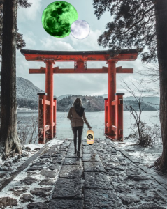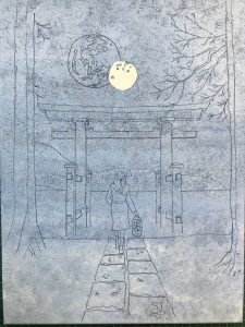 So as before I trawled the internet looking for images to use as a reference. Initially I had envisioned a procession of Japanese-style spirit gates flanking a staircase, but I came across this image and quite fell in love with it. I added the moons and the lady’s lamp, but made no other significant changes as the composition was nearly perfect.