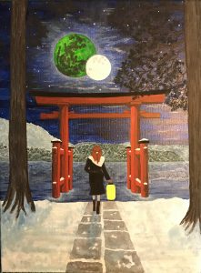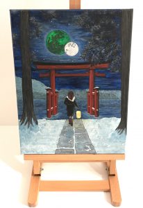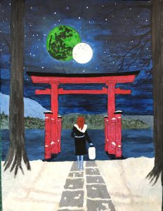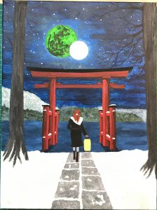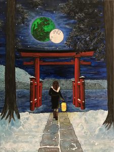 As I added more detailed shading to the spirit gate the image began to appear more three-dimensional. I also began to pick out the details of the wooded area on the far side of the river. After I removed the moon shadow, I added more detail to the path and really cleaned up the dirty looking snow. I also finished blocking in the last of the non-detailed areas such as the lantern and Keyanna’s legs.