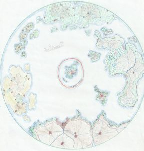 For a short time, I toyed with the idea of setting my fantasy stories on a flat world. I had obviously been reading too many of Terry Pratchett’s discworld books, which are still a personal favourite. I cannot remember any of the particulars about the stories that related to this map.