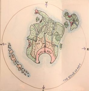 As you can see in this early map, I seemed determined on that day to give everything three letter names. Whilst the shared name for the capital city and the main island stuck, I’ve never refered to any of the smaller towns or islands by the names shown, if at all.
