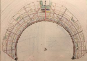 As I’ve already mentioned the city and the island have rotated 90°, but the general layout of the city has stayed the same. As Artens work on logic, it made sense to put the city on a grid basis, with the bay forming the shape of a crescent moon, it made sense to radiate the streets from that curve. The perfect shape of the bay was not a natural phenomenon, but I will explain that in more detail in another article. In this sketch I tried to identify main thoroughfares in red, secondary roads in orange and smaller streets in yellow.
