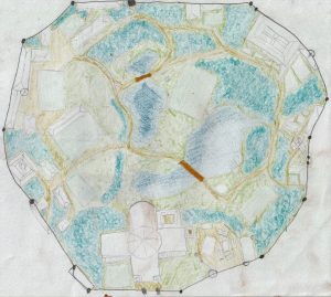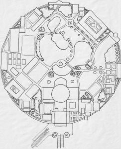 In this image I captured my first idea of having the cathedral complex in a natural bowl or hollow, I imagined that this naturally fortified location could have been the crater of an ancient extinct volcano. The concept of having the academy along with government administration buildings, within a central location made me consider names like ‘The Artens Nest’ and ‘Point Zero’. When I started drawing this map, I filled in a lot of areas with open grass and screening shrubberies, it soon became clear that it was a vast garden. In this plan the ‘cradle gardens’ as I called it, is approximately 1100 m from one side to the other. I liked this concept so much that I worked up the plans and my ideas further.