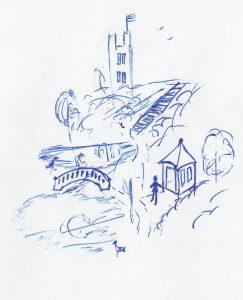 This ink drawing shows the same plan with the addition of trees to the shrub areas. We can work our way around the complex by starting at the top at the equivalent of 12 o’clock. At the 12 o’clock position is an elevated viewing platform which looks over the perimeter wall and down onto the thickly wooded area behind the complex. To the right of the viewing platform is the administration building for the library which is the large building with the courtyard at 1 o’clock. At 2 o’clock position is the observatory, where Tiana and Miguel have their first date. At the 3 o’clock angle are three buildings with formal gardens to their left, these buildings hold some of the senior administrative officers for the governmental departments. Between four and five is a series of buildings including an oblong one with a round tower, this mini complex is the offices and living quarters of the Guider. The Guider’s personal garden is now the little triangular space up against the outer wall. Below the cathedral is still the Pilgrim Plaza and its associated buildings, on either side of the lower sections of the cathedral are monastic administration buildings. The three buildings at the 7 o’clock position are guesthouses and the building with the courtyard at 8 o’clock is the hospital. There are seven various sized and shaped buildings between 9 and 12 which hold the major classrooms and dormitories for the academy, in this area there are also playing fields and a parade ground. At 11.40 just to the left of the viewing platform is a square tower with four turrets, this building has no practical purpose, but it looks good on the horizon. This ink sketch was an early idea I had for the cradle gardens, this is the view you would get more or less, if you are standing on the path close to the central point tree, you’d be able to see from their the summerhouse, the bridge and the tower. On the larger of the two lakes is a boathouse and it is the large lake the students host their annual boat race on, which Tiana and Miguel won in his final year.