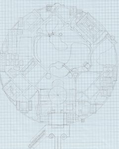 There is a tree that stands alone at the centre of the garden surrounded by a path by the large lake, this tree indicates the central point of the near-perfect circle, that is the overall shape of the complex. It was at this stage I began to think about the unnaturally perfect circle being the results of an unnatural accident. I’d already decided that the island of Art was a mountaintop from another world, brought through the layers of reality during an experiment gone wrong, so it seemed logical that the explosion that destroyed the lab would have left a large crater. With the technology that the Artens possessed they would have utilised this space by building a geo-front and creating vast facilities below ground. We’ll be exploring the geo-front and the subterranean aspect of the cathedral complex in another article.