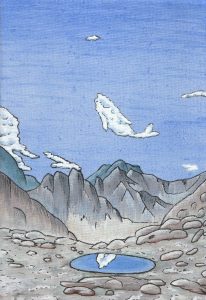 Irresponsibly leaving his goats behind, the young man scrambles down into the little valley, the wind doesn’t blow here at all, the silence is all consuming and more than a little frightening. Faint ripples still played across the water in the pool from the rock that had fallen into it, but even as Hans watched, the final ripples faded away, leaving the water as perfect as a silver mirror. Hans was nearly thirteen he was old enough to have heard the stories about the sky door, and he was old enough not to believe all of the stories that his grandmother told him and his younger sisters. Curiosity drew him closer, surely if it was nothing but a story, all he would see was his own reflection and that of the sky. Carefully stepping around loose rocks he made his way to the water’s edge and lent over. He couldn’t see his reflection, so he bent over a little more. When he lost his balance and instinctively closed his eyes, he thought for a second how foolish he would look when he returned home all soaking wet.