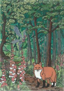 It was a hot autumn day, soon the leaves that made up his waistcoat dried out and crumbled, ripping at the seams. The leaf of wild rhubarb went so limp it covered Finn’s eyes, and he had to throw it into the bushes. The neckerchief made from iris reeds became caught on a low hanging branch, as Finn struggled to get free, he ripped it and it fell away. By the time the fox reached Sophie’s house all he had left was the gloves made from flowers, he just hoped that would do.